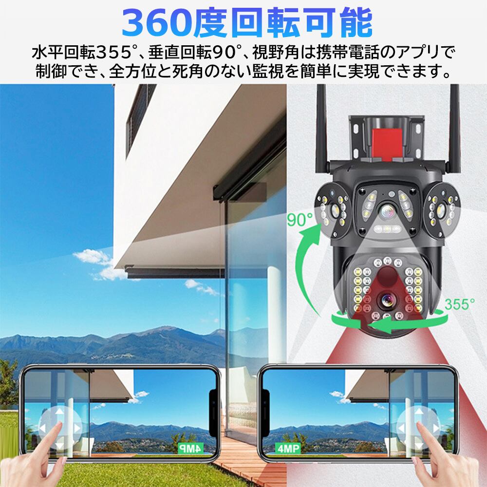 400万画素の高解像度を誇る防犯カメラは、2550Pの鮮やかな映像を実現。屋外でも家庭用として最適で、360度の首振り機能を搭載し、どんな角度からでも幅広い範囲を見守ります。夜間でもカラー映像を提供し、安心の防犯対策をサポートします!