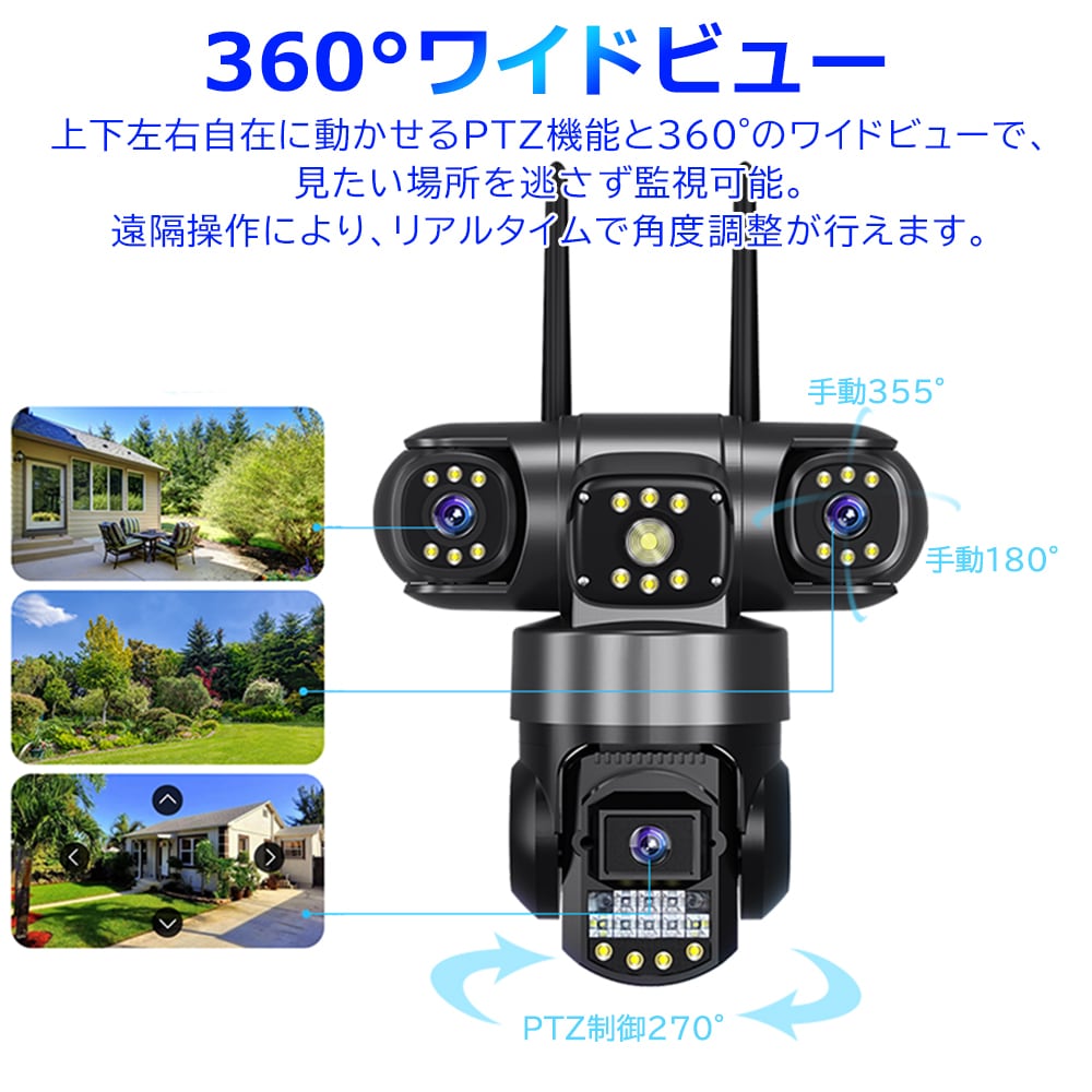 防犯カメラ 屋外 三眼カメラ 600万高画素 PTZカメラ 監視カメラ ワイヤレス WiFi 動体検知 双方向音声 IP66防水 警報通知 夜間カラー撮影 家族共有 常時録画 Micro SD/クラウドストレージ対応 お宅/庭/玄関/駐車場/店舗/ゴミ場