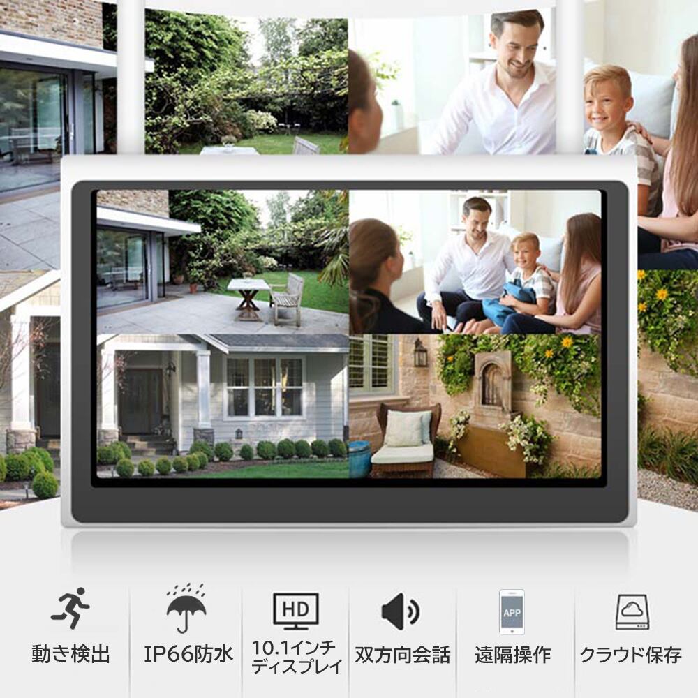 防犯カメラ ワイヤレス 屋外 ソーラー 400万画素 4台 パネルカメラ セット 10インチLCD液晶モニタ一体型NVR 遠隔監視 IP66防水防塵 PIR動体検知 警報通知 屋内/屋外 セキュリティ スマホ連動 遠隔監視 常時録画 防犯対策 Eseecloudアプリ対応