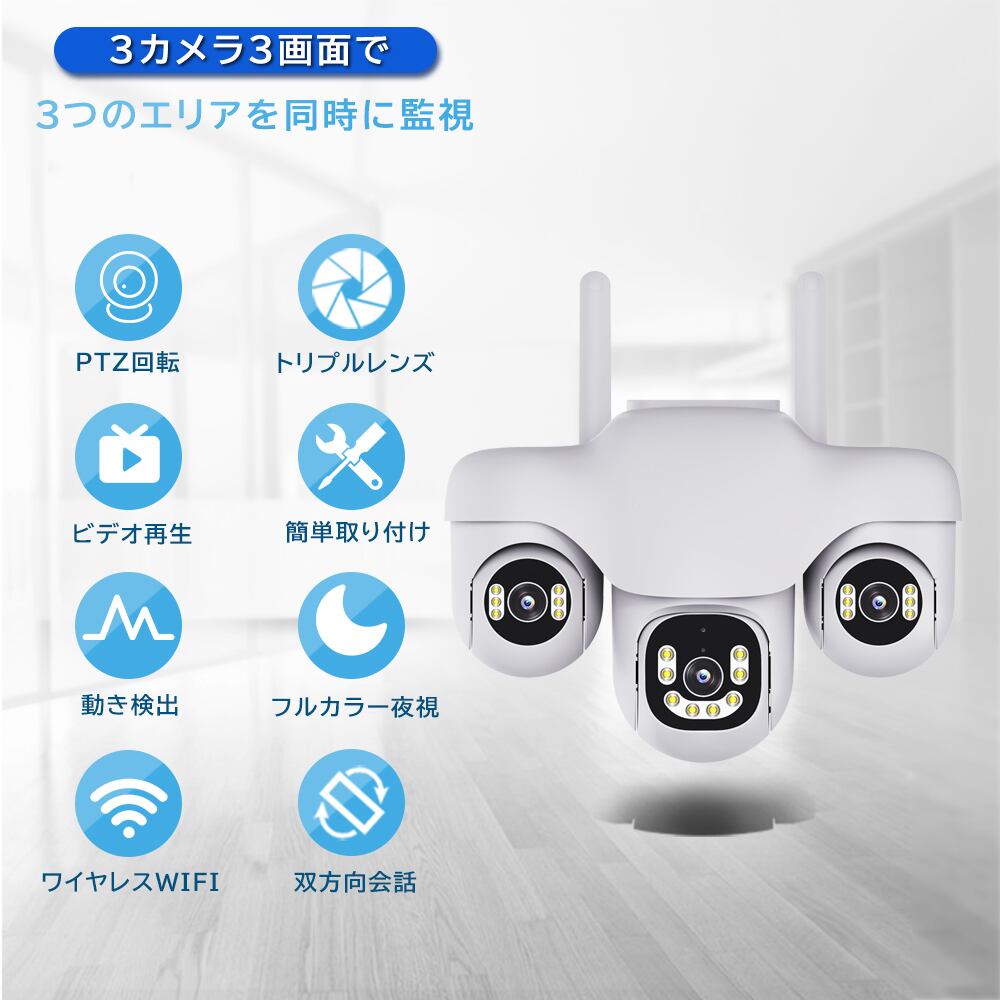 防犯カメラ 屋外 360°全方位 自動追尾 PIR人体検知 3雲台・3画面 監視カメラ 遠隔操作 wifi接続 夜間カラー撮影 PTZ機能 首振り 警報通知 双方向音声通話 遠隔操作 警報録画 SDカード/Cloud録画 対応 自動上書き 防水 家族共有 店/玄関/ドア/家庭用 見守りカメラ