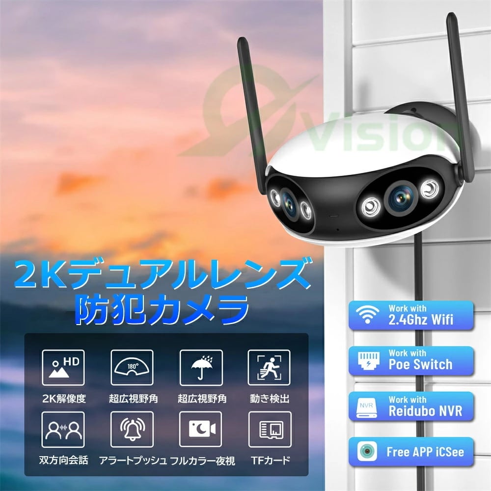 【180°超広視角】防犯カメラ 屋外 家庭用 ワイヤレス WIFI 2K画質 400万画素 防水 録画機能 無線 動体検知 双方向音声 映像共有 広角レンズ 監視カメラ SDカード対応 夜間撮影 スマホ 遠隔操作 死角なし ONVIF/NVR対応 業務用 玄関 倉庫 駐車場