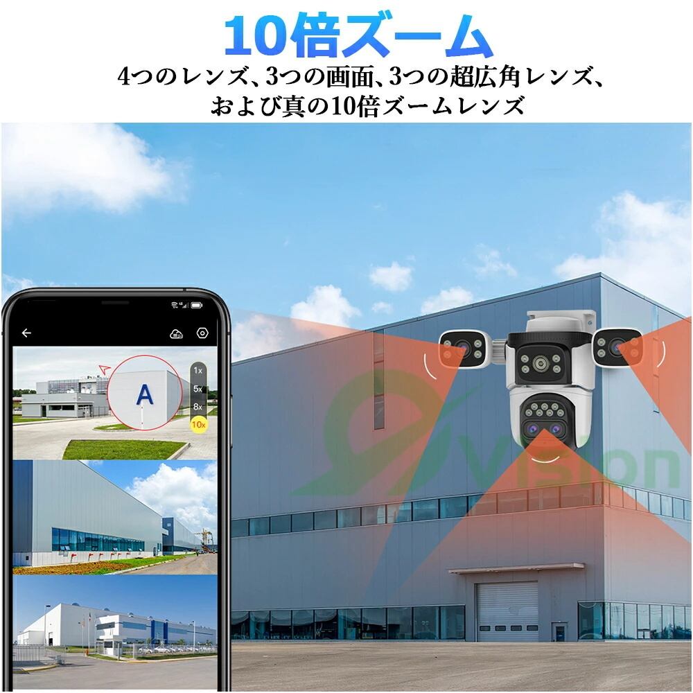 【10倍ズーム】 10倍の光学ズームにより、遠くの詳細もクリアに捉えられます。多倍率ズームの大広角レンズで、遠近両方の視野をカバーし、顔認識も可能。APPで簡単にズームイン・アウトができます。